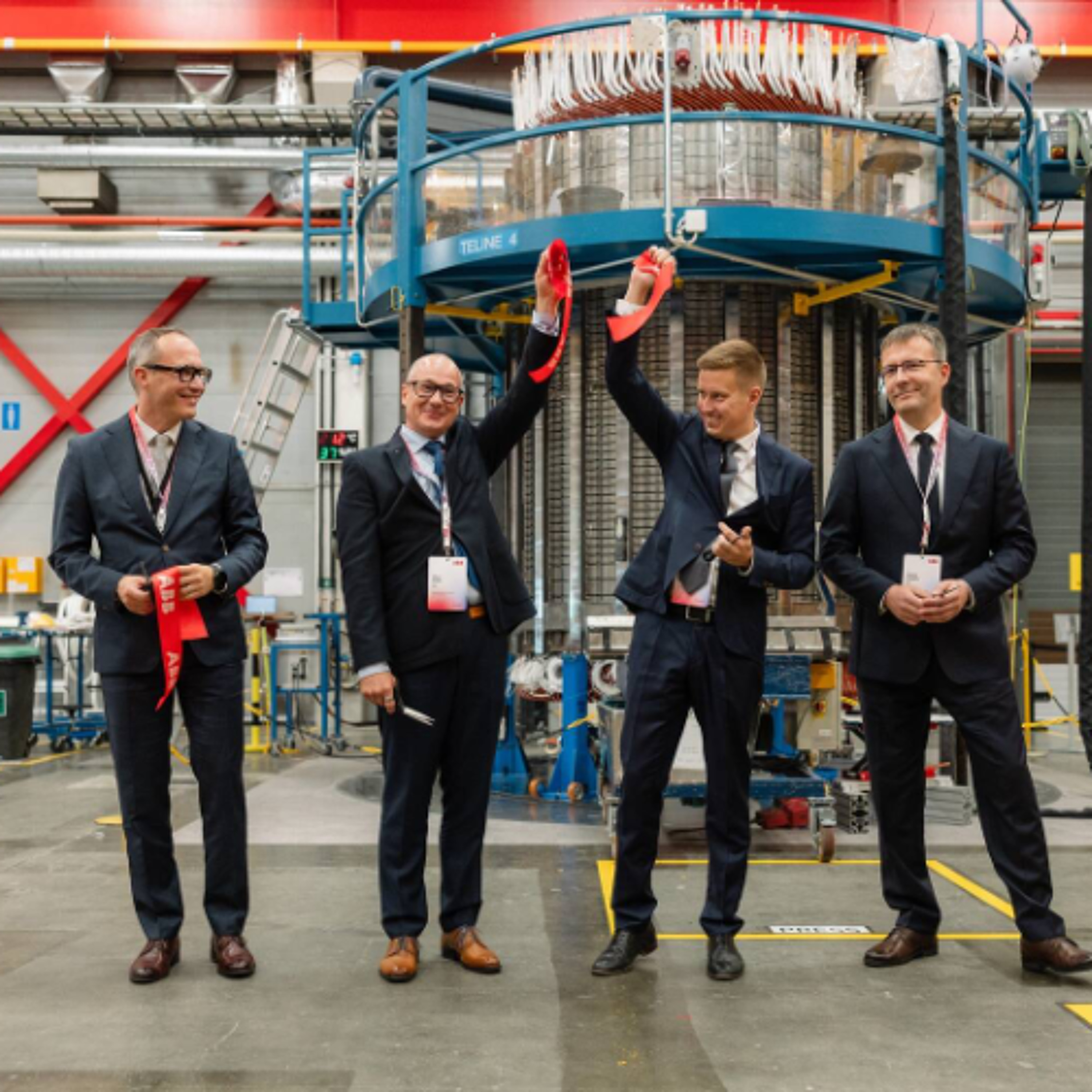 Fotol paremalt ABB globaalse sünkroonstaatorite ärivaldkonna juht Tatu Järvenpää, ABB tootmisüksuse juht Argo Aavik, majandusminister Erkki Keldo ning ABB mootorite ja generaatorite tehase juht Indrek Saarma. Pildi allikas ABB